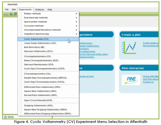 Pine 电化学工作站-AfterMath 软件方法介绍-CV-2Pine 电化学工作站-AfterMath 软件方法介绍-CV-23 AfterMath中基本步骤要在 AfterMath 中执行一个循环伏安法实验,请从“Experiments ”菜单中选择“Cyclic Voltammetry”(CV)(参见图4)。