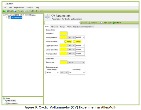 3.1 Basic 选项卡提示: 点击 AfterMath 顶部栏上的自动填充AutoFill 按钮(2019年5月之前版本点击"I Feel Lucky" ) ,以合理的起始值自动填充所有必需的参数。虽然所提供的值可能不适合您的特定研究系统,但它们是开始您的实验的合理参数,特别是如果您对方法设置是不熟悉的话。 Basic选项卡包含执行 CV 实验所必需的基本参数的字段。AfterMath 在所需条目为空时将字段阴影化为黄色,在条目无效时将字段阴影化为粉红色(参见图6)。