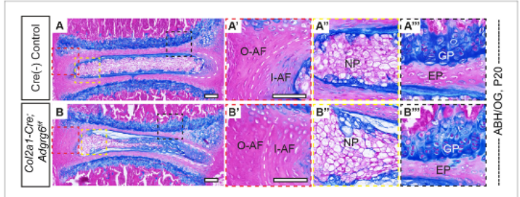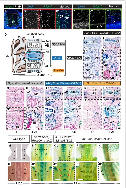 不同Cre株重组Rosa26lsl-lacZ报告 研究结果显示1、脊柱稳定性机制:ADGRG6通过调控CAMP/CREB信号通路维持脊柱软骨和肌腱的力学性能,其缺失会导致小鼠出现进行性脊柱侧弯(曲线达46˚)。 2、设备性能验证:KUBTEC Xpert 80成功捕捉到椎间盘结构变化(如髓核偏移和纤维环层排列异常),数据精度支持定量分析。
