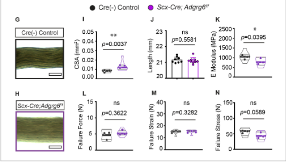 3、生物力学发现:Scx-Cre; Adgrg6f/f小鼠肌腱弹性模量显著降低,证实结缔组织缺陷是侧弯的关键诱因。