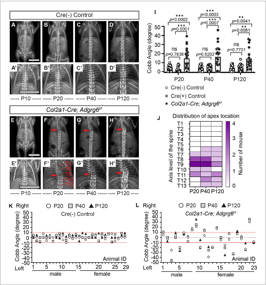 脊柱侧弯模型与X射线成像对比 团队利用KUBTEC Xpert 80对基因编辑小鼠(如Col2a1-Cre; Adgrg6f/f模型)进行纵向追踪,通过高精度X光片分析脊柱曲度(Cobb角测量)。同时结合组织学(如Alcian Blue染色)和生物力学测试,系统评估了ADGRG6基因缺失对脊柱软骨、肌腱力学性能的影响。设备的高清成像能力清晰展现了椎间盘楔形变和髓核偏移等微观病理特征。